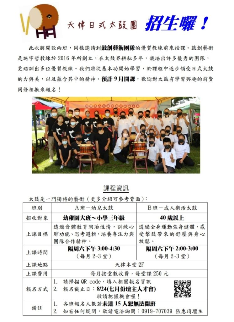 目前天律太鼓團新班正在招生中,不分男女老少只要對太鼓有興趣皆可以參加,詳細資訊請參閱以下招生連結說明。