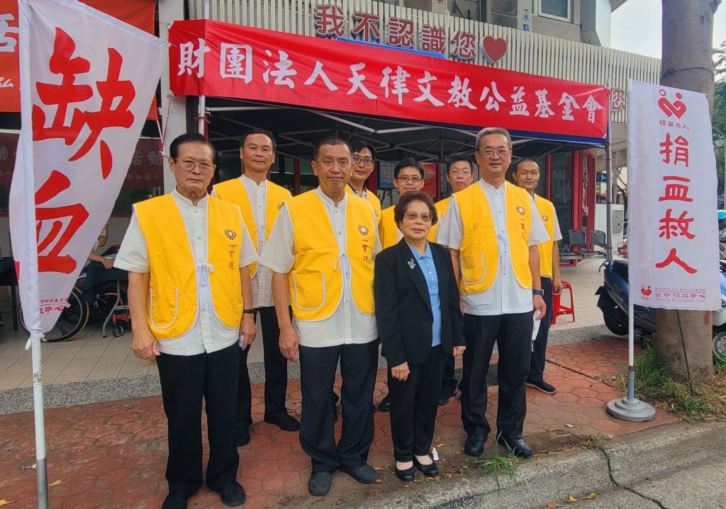 財團法人天律文教公益基金會陳董事長、台中市弘道分會黃榮譽理事長、陳理事長及各位理監事共同帶領志工人員參與捐血與服務工作。